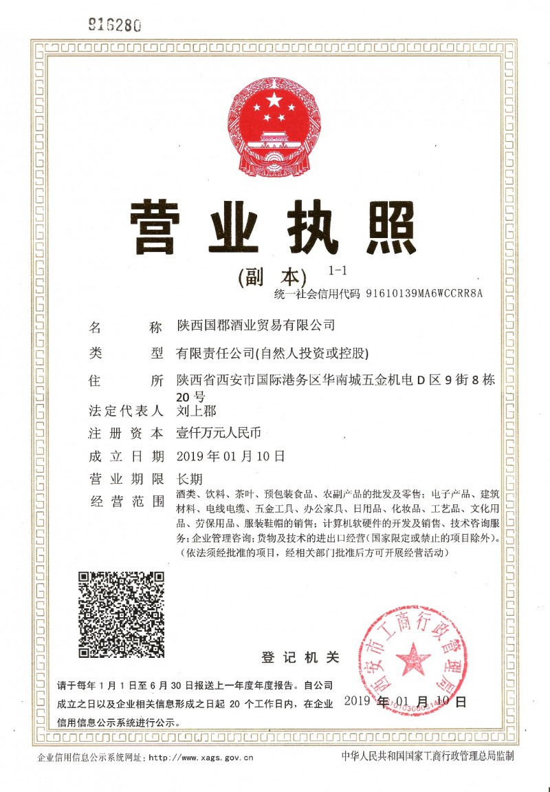 首頁 > 榮譽(yù)資質(zhì) > 陜西國郡酒業(yè)營業(yè)執(zhí)照